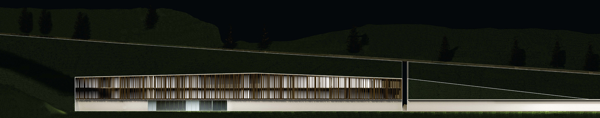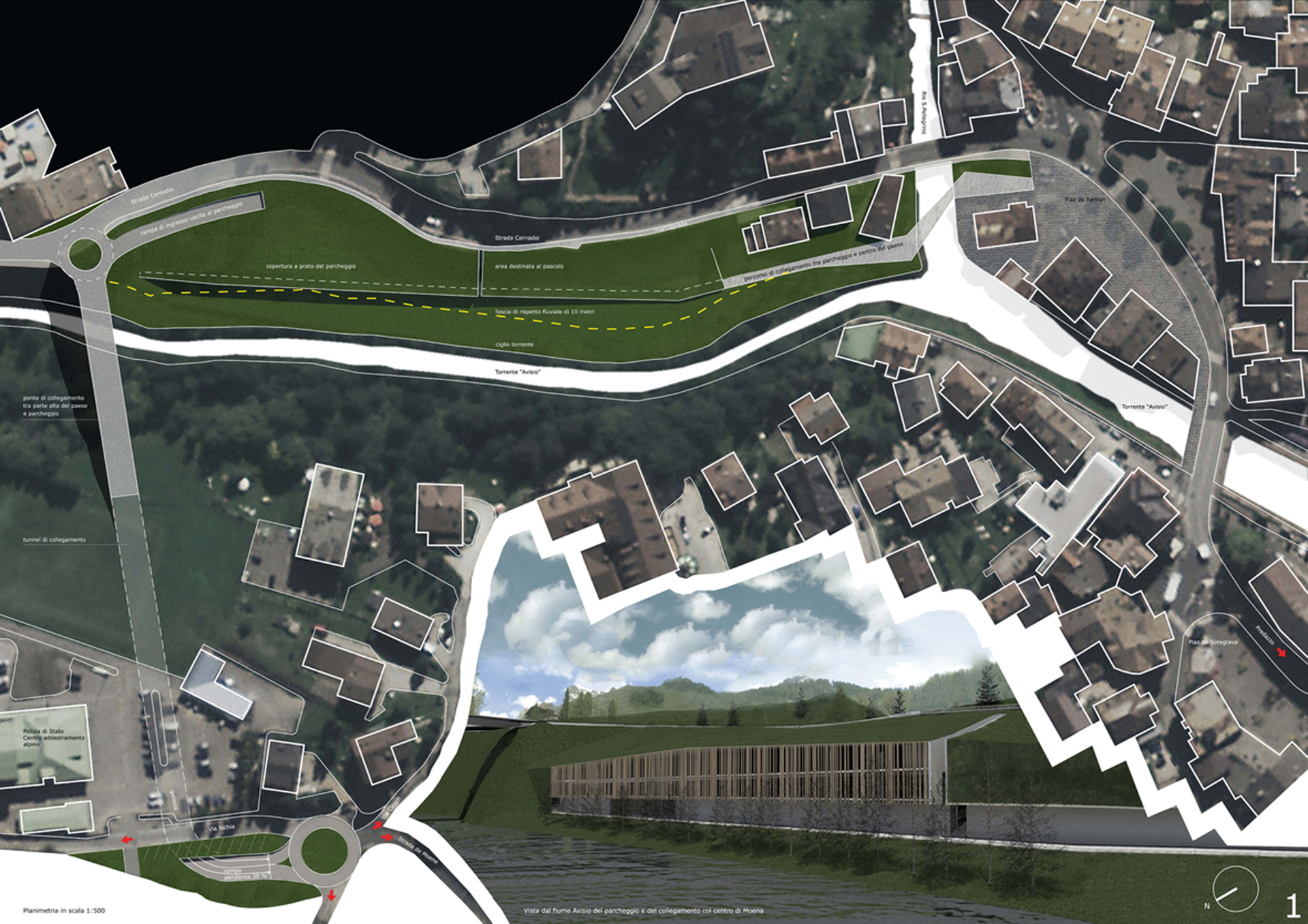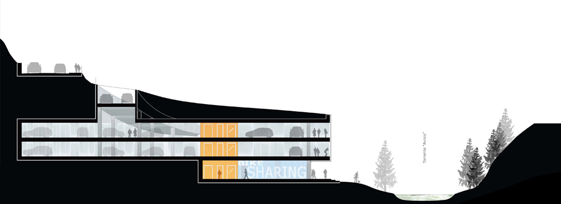 Il sedime indicato per il progetto del parcheggio, esteso anche allo spazio sottostante strada Cernadoi, diventa un’area sufficiente per la realizzazione di un parcheggio interrato composto di soli due piani, che contengono duecentocinquanta posti auto. I vantaggi di questa scelta progettuale sarebbero non soltanto di natura economica, ma soprattutto di natura paesaggistica. Sarebbe possibile costruire un manufatto di notevoli dimensioni volumetriche in grado di inserirsi mimeticamente nell’ambiente, in modo armonico, senza turbare l’equilibrio paesaggistico del luogo. Un solo segno si alza in prospetto e taglia il profilo della vallata. Un’incisione da cui esce luce si affaccia sulla valle del torrente Avisio. La scelta fatta è precisa: occupare il sedime di strada Cernadoi apporta una notevole riduzione dell’impatto ambientale dell’opera in località Longea.