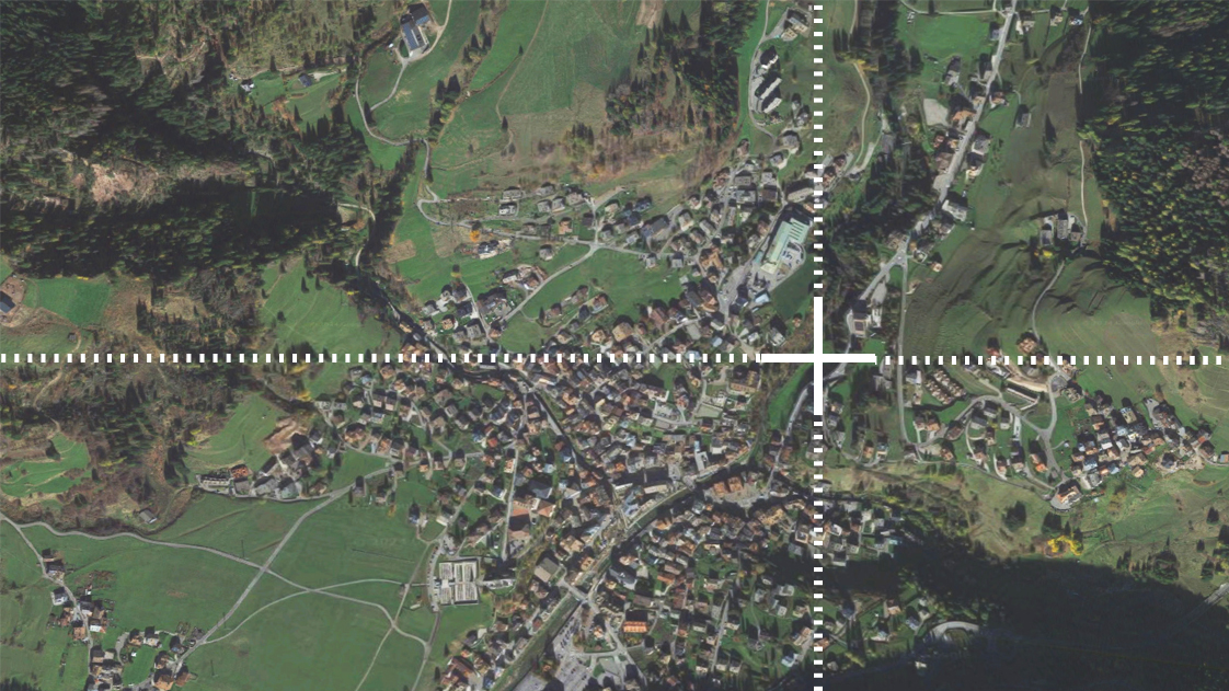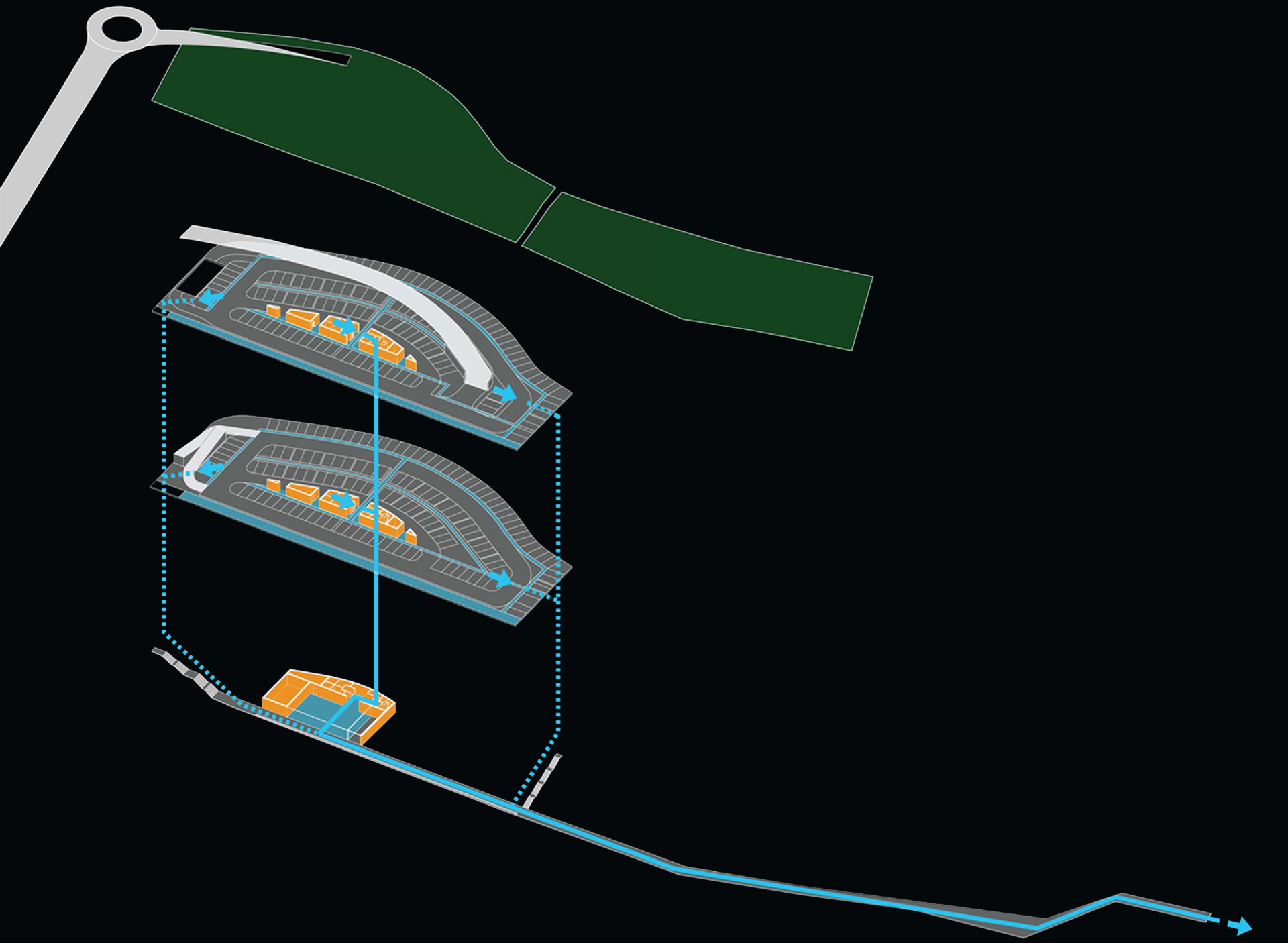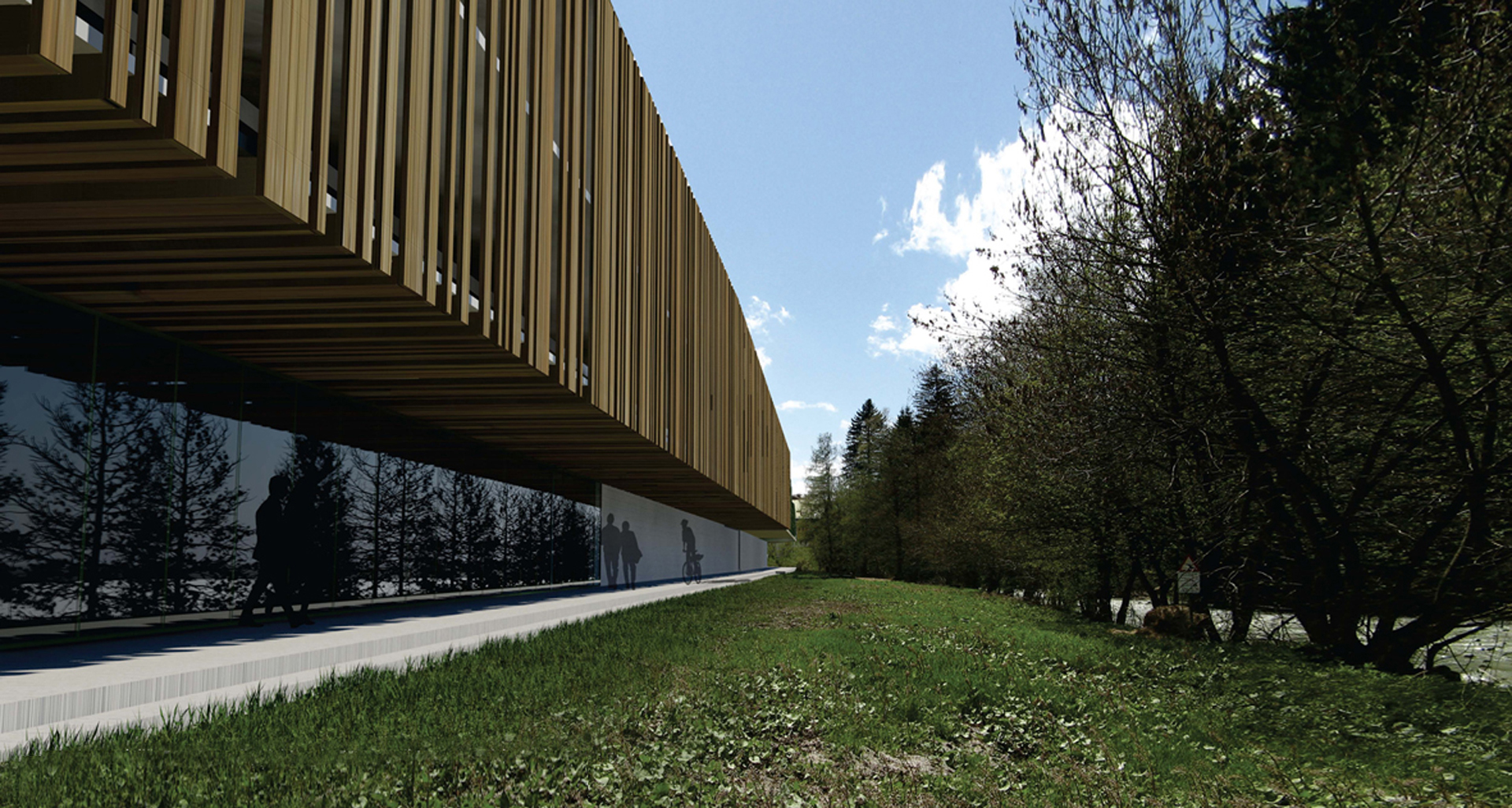 Il sedime indicato per il progetto del parcheggio, esteso anche allo spazio sottostante strada Cernadoi, diventa un’area sufficiente per la realizzazione di un parcheggio interrato composto di soli due piani, che contengono duecentocinquanta posti auto. I vantaggi di questa scelta progettuale sarebbero non soltanto di natura economica, ma soprattutto di natura paesaggistica. Sarebbe possibile costruire un manufatto di notevoli dimensioni volumetriche in grado di inserirsi mimeticamente nell’ambiente, in modo armonico, senza turbare l’equilibrio paesaggistico del luogo. Un solo segno si alza in prospetto e taglia il profilo della vallata. Un’incisione da cui esce luce si affaccia sulla valle del torrente Avisio. La scelta fatta è precisa: occupare il sedime di strada Cernadoi apporta una notevole riduzione dell’impatto ambientale dell’opera in località Longea.