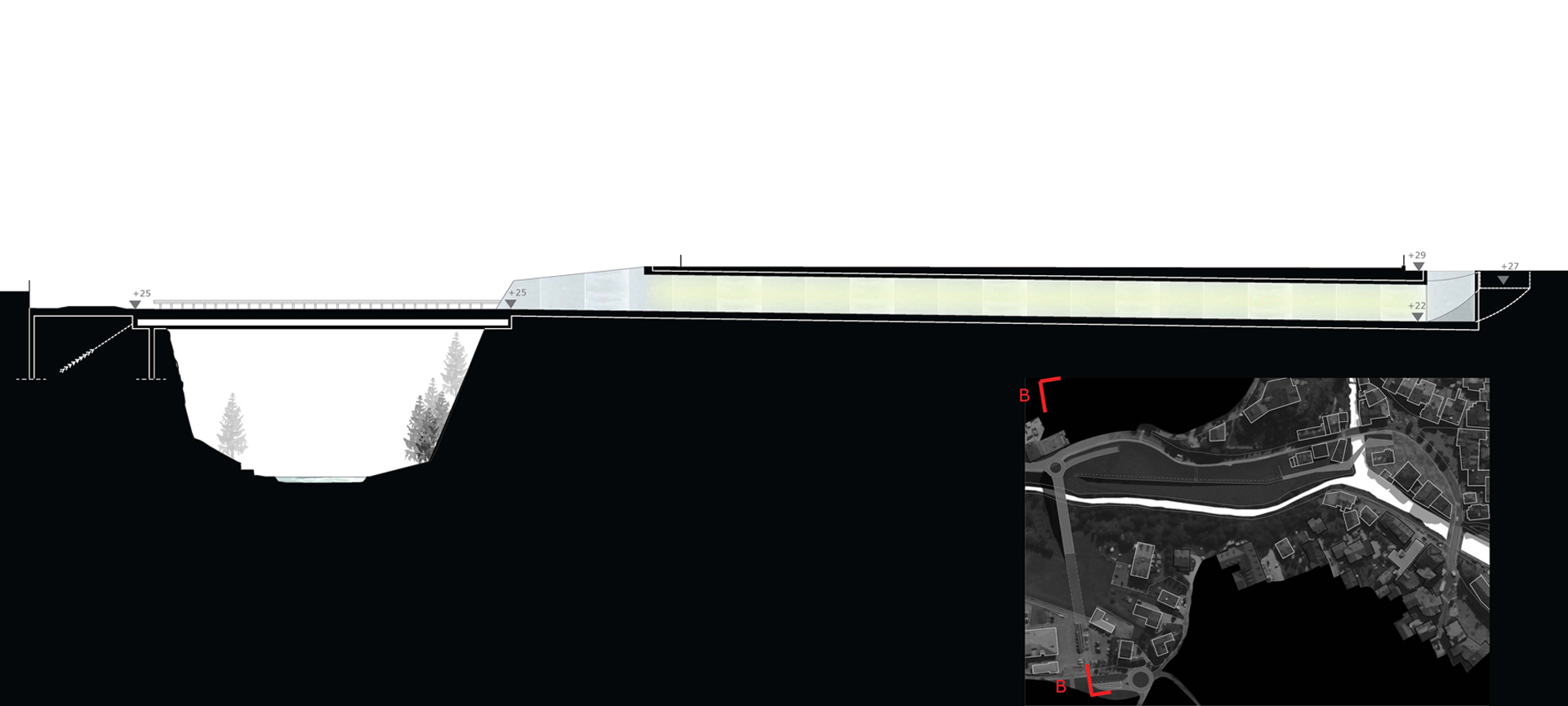 Al percorso pedonale vi si accede direttamente dal parcheggio, utilizzando i due ascensori o il vano scala centrale che portano su un’ampia area di uscita coperta, filtro tra il parcheggio e il dolce argine del fiume. Il nuovo percorso in progetto, in ghiaino compattato drenante, costeggia il fiume Avisio ed è sufficientemente largo da consentire sia il transito pedonale che quello ciclabile. Tale collegamento si prevede di tenerlo piano per tutta la parte di sviluppo del livello -3 (quello di uscita dal parcheggio). Successivamente il percorso sale con una pendenza inferiore all’8%, passando tra gli orti attualmente presenti, per cui è previsto un riposizionamento in prossimità delle rispettive proprietà. L’innesto con il paese avviene sfociando su Piaz de Ramon, soluzione che a nostro avviso risulta essere la più praticabile perché intercetta un giardino pubblico ed obbliga i fruitori del percorso a scendere e a lasciarsi condurre attraverso il sistema urbano delle piazze esistenti.