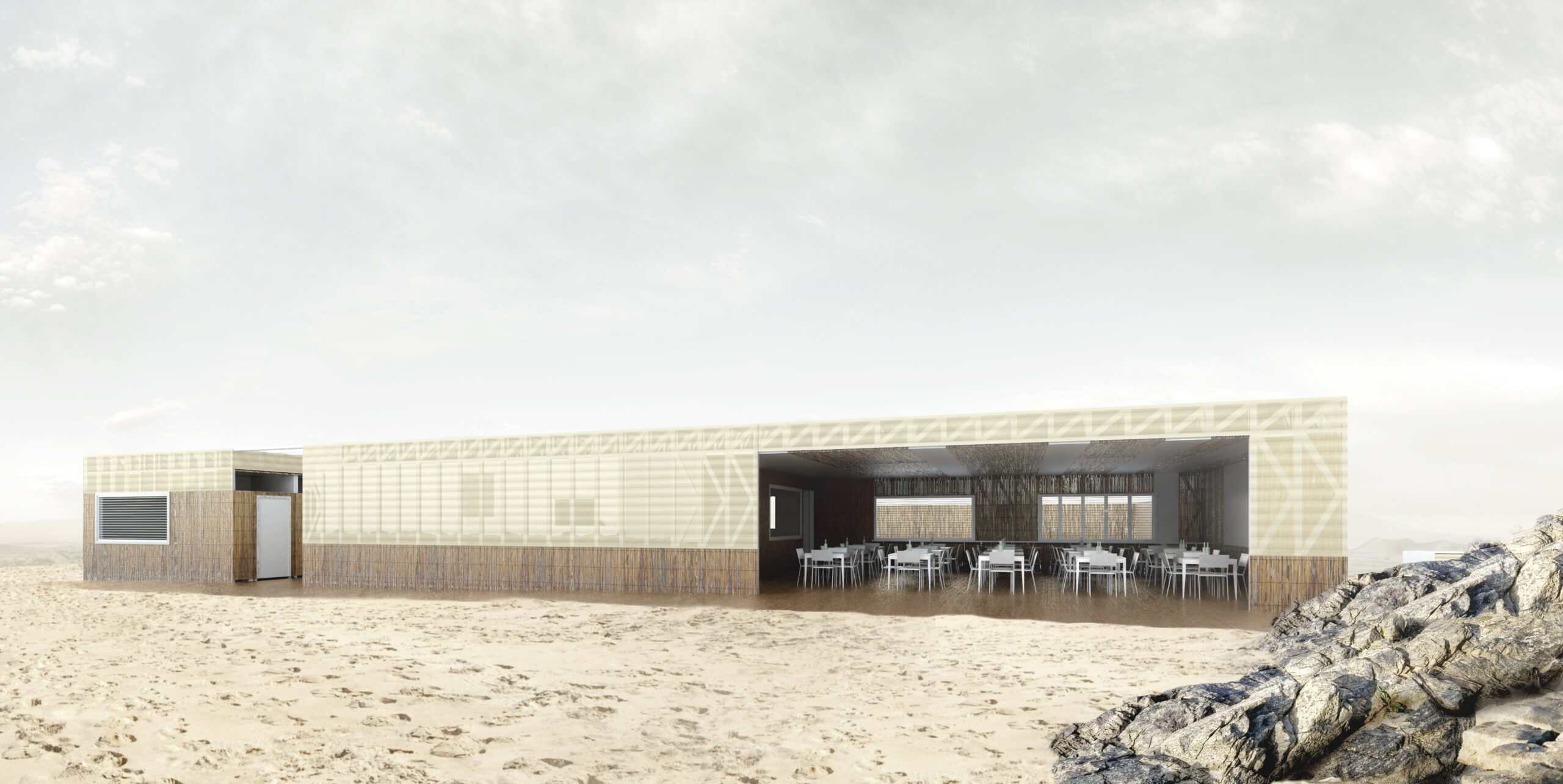 Lo stabilimento balneare che racchiude in sé il deposito (con la reception, i bagni e le cabine), così come il chiosco per la ristorazione con lo spazio d’ombra(l’elemento volumetricamente più importante del sistema) o come il punto di avvistamento-salvataggio o come i capanni a noleggio con verandina sono oggetti formati da una struttura leggerissima in steel-frame (brevettata e facilmente realizzabile) poi rivestita da un guscio esterno, una pella in policarbonato e/o cannicciato.
