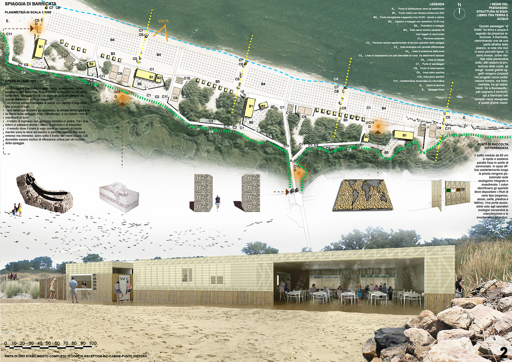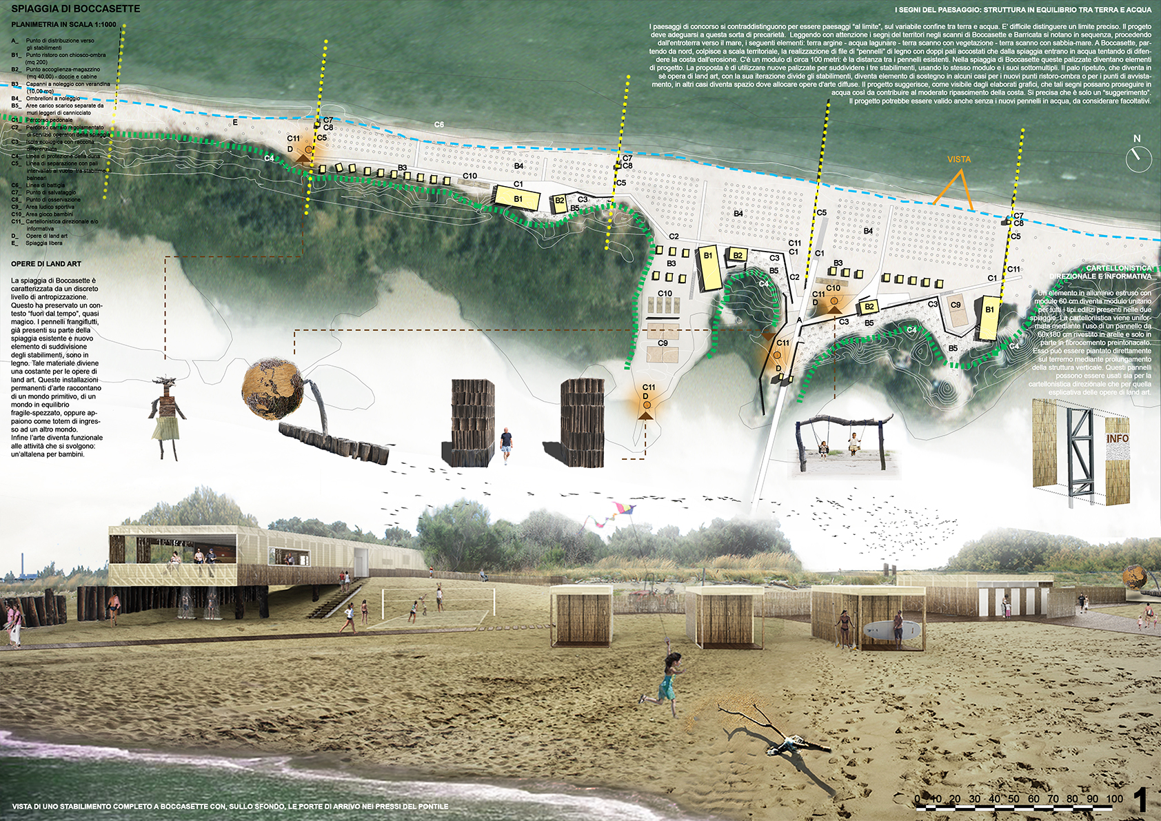 Leggendo con attenzione i segni del territori negli scanni di Boccasette e Barricata si notano in sequenza, procedendo dall’entroterra verso il mare, i seguenti elementi: terra argine- acqua Lagunare-terra scanno con vegetazione- terra scanno con sabbia-mare. A Boccasette, partendo da nord, colpisce a scala territoriale, la realizzazione di file di “pennelli” di legno con doppi pali accostati che dalla spiaggia entrano in acqua tentando di difendere la costa dall’erosione. C’è un modulo di circa 100 metri: è la distanza tra i pennelli esistenti. Nella spiaggia di Boccasette queste palizzate diventano elementi di progetto. La proposta è di utilizzare nuove palizzate per suddividere i tre stabilimenti. Il palo ripetuto, che diventa in sè opera di land art, con la sua iterazione divide gli stabilimenti, diventa elemento di sostegno in alcuni casi per i nuovi punti ristoro-ombra o per i punti di avvistamento, in altri casi diventa spazio dove allocare altre opere d’arte diffuse. Il progetto suggerisce, come visibile dagli elaborati grafici, che tali segni possano proseguire in acqua così da contribuire al moderato ripascimento della costa. Si precisa che è solo un “suggerimento”. Il progetto potrebbe essere valido anche senza i nuovi pennelli in acqua, da considerare facoltativi.
