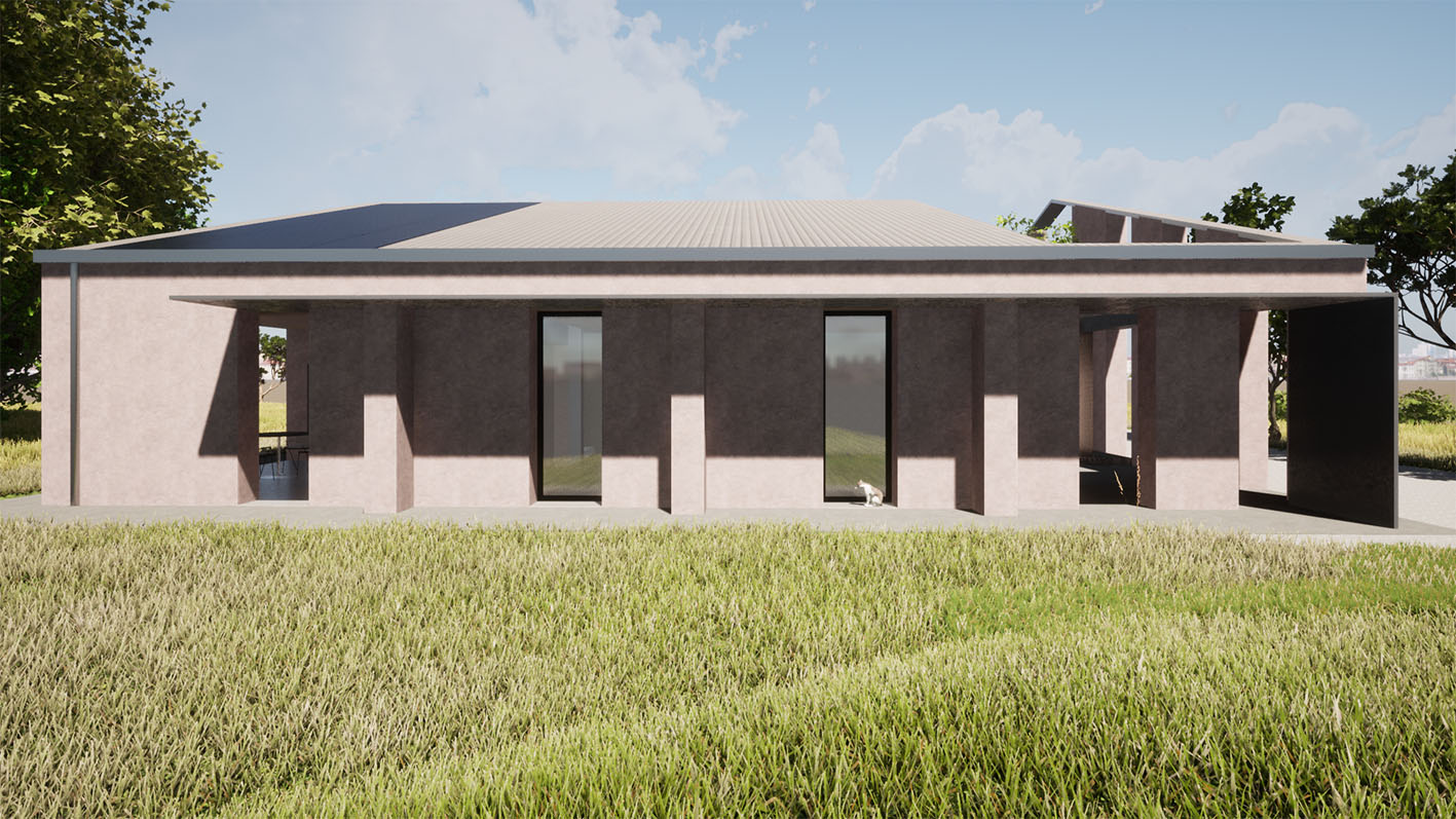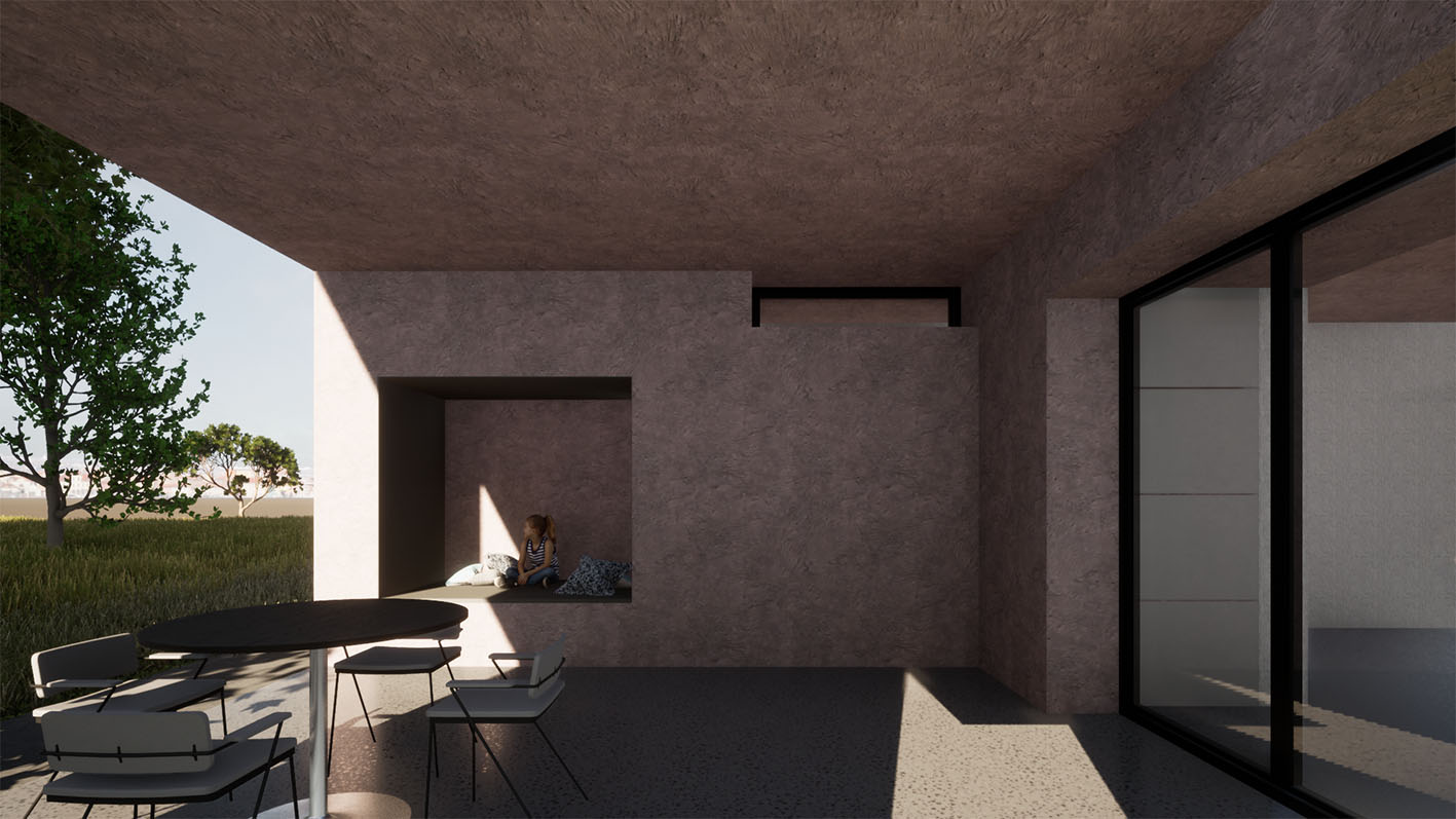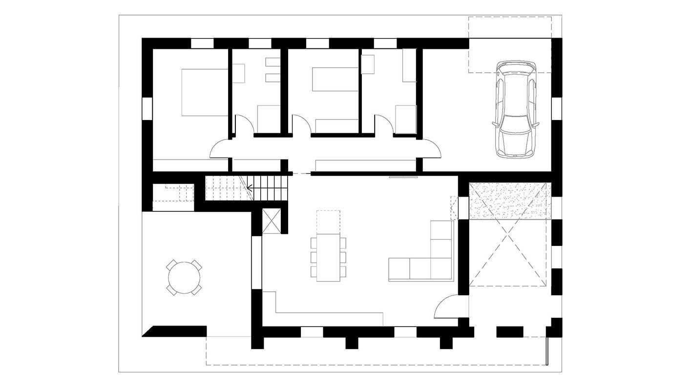 L’edificio in oggetto nasce come casa bifamiliare e per circa dieci anni rimane non finita. Il progetto parte dal concetto di rovina contemporanea per trasformare l’edificio in una casa unifamiliare a due piani. Il volume a due falde compatto viene scavato da un patio, un portico, due terrazze e inciso da tagli che rendono comunque riconoscibile la forma unitaria. Un portico a sud completa il manufatto verso l’ingresso. Metallo e intonaco sono i due materiali scelti per l’intervento.