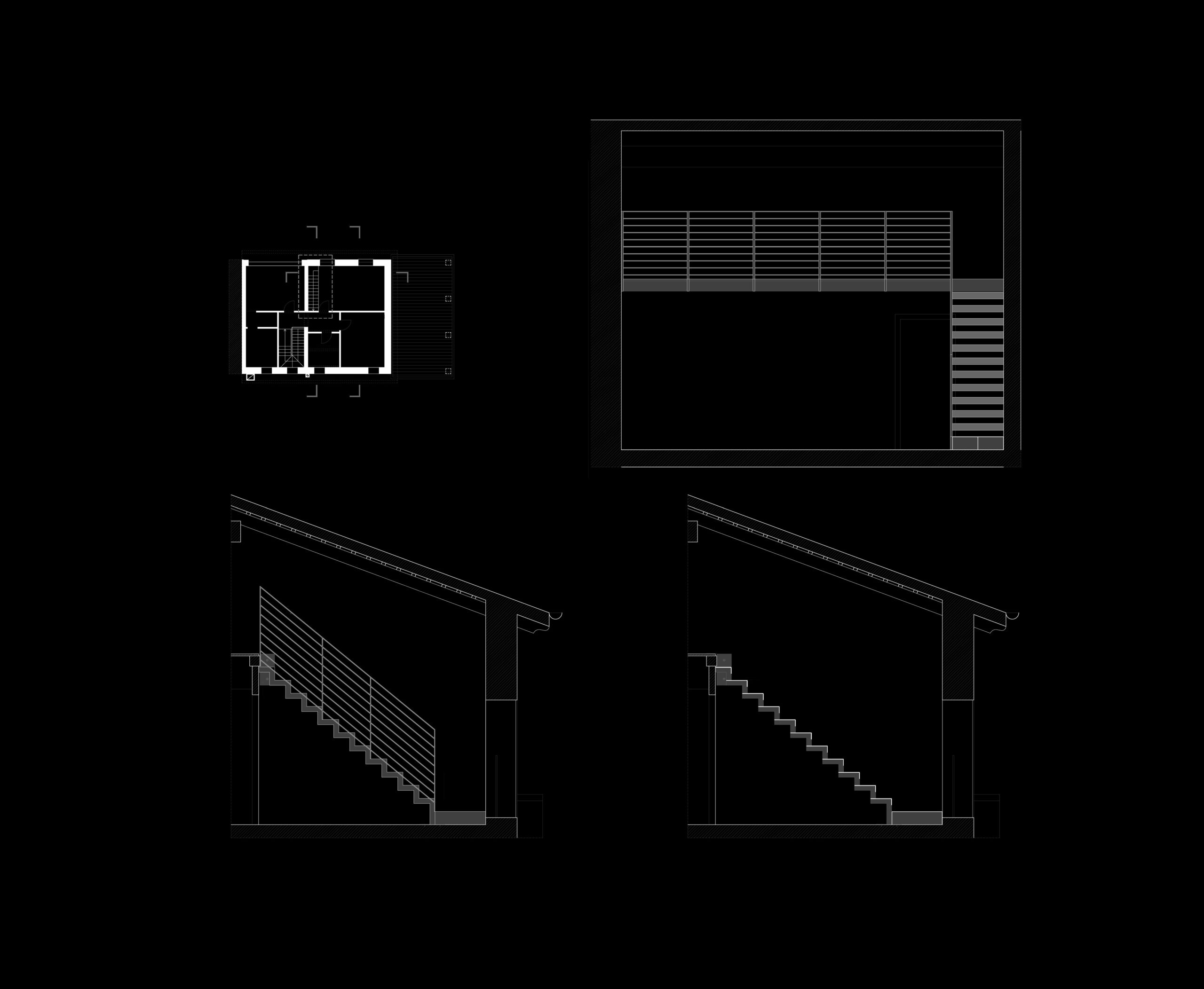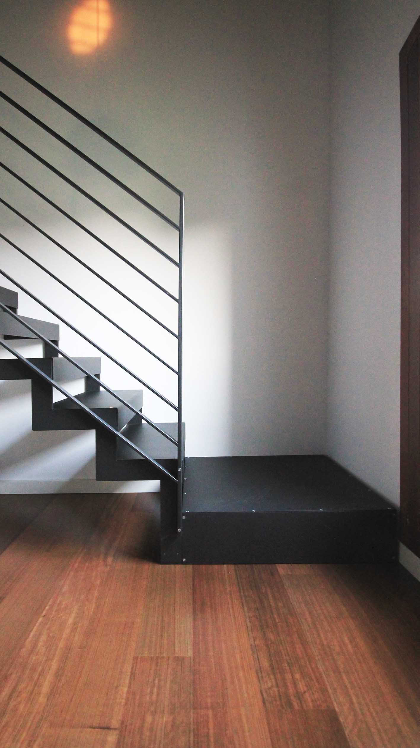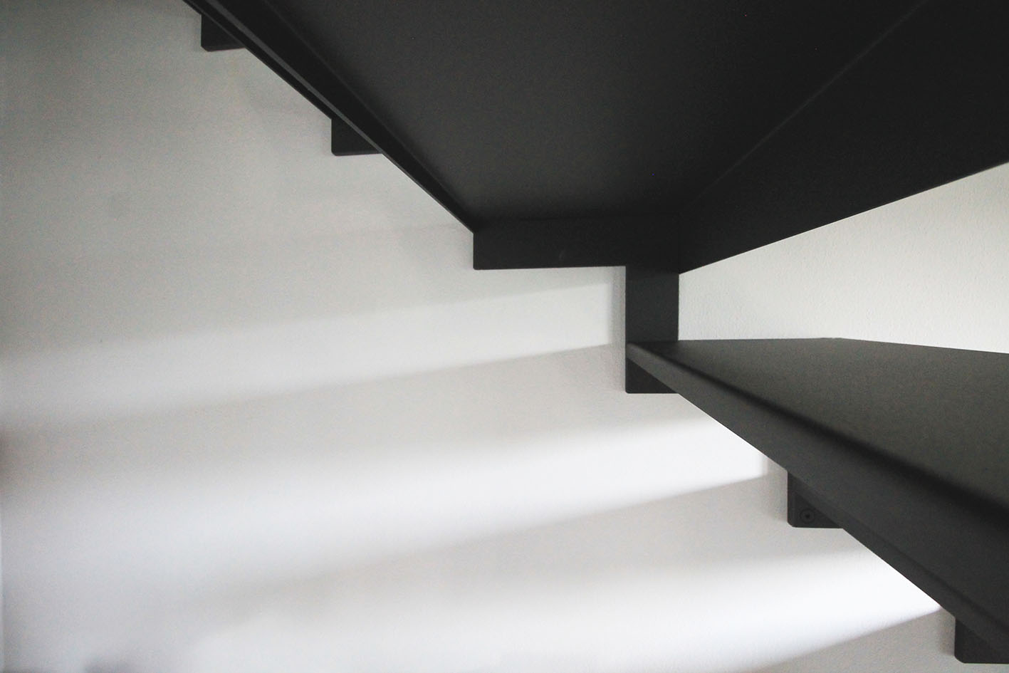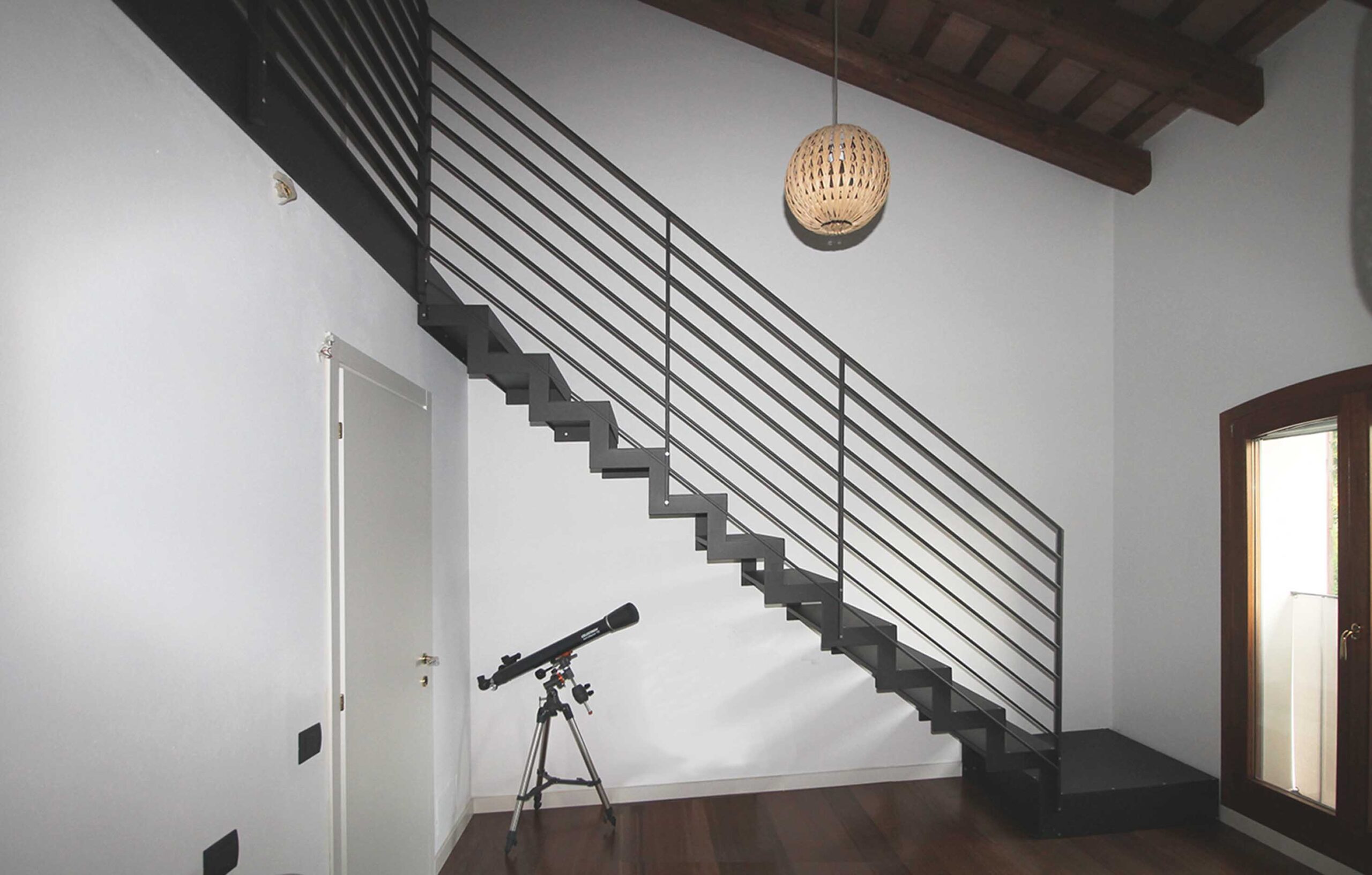 Lo studio di interni realizzato riguarda una scala a servizio di un soppalco su una camera da letto. La precisione e la nettezza della scala, completamente in metallo color antracite, mediante una geometria elementare che segue l’andamento del gradino si inserisce su uno spazio determinato dalla conformazione dell’esistente stanza. La scala è a fianco della porta di ingresso, sale leggera e diventa poi parapetto del soppalco determinando un unico elemento costruttivo. Il colore antracite s’intona con l’esistente scala principale, di cui lei stessa è figlia.